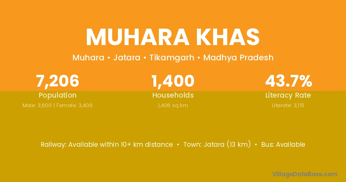 Muhara Khas village has a total population of 7,206 people, of which 3,800 are males and 3,406 are females.
