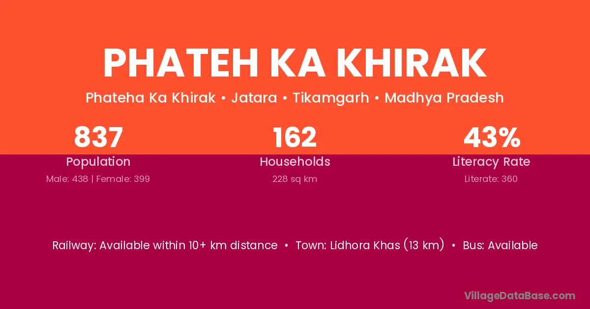 Phateh Ka Khirak village has a total population of 837 people, of which 438 are males and 399 are females.