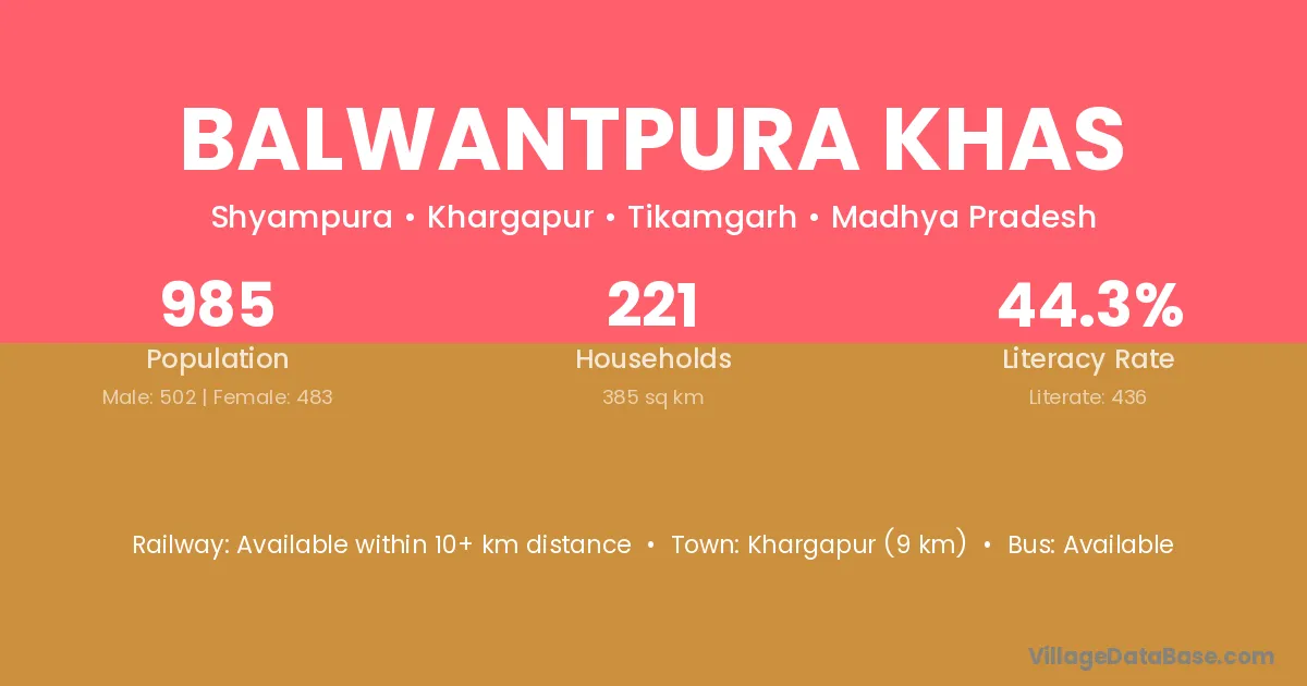 Balwantpura Khas village has a total population of 985 people, of which 502 are males and 483 are females.