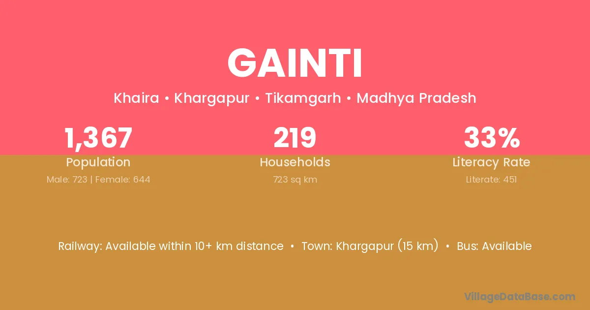 Khargapur (15 km) is the nearest town to Gainti village for major economic activities and is located approximately 15 km away.