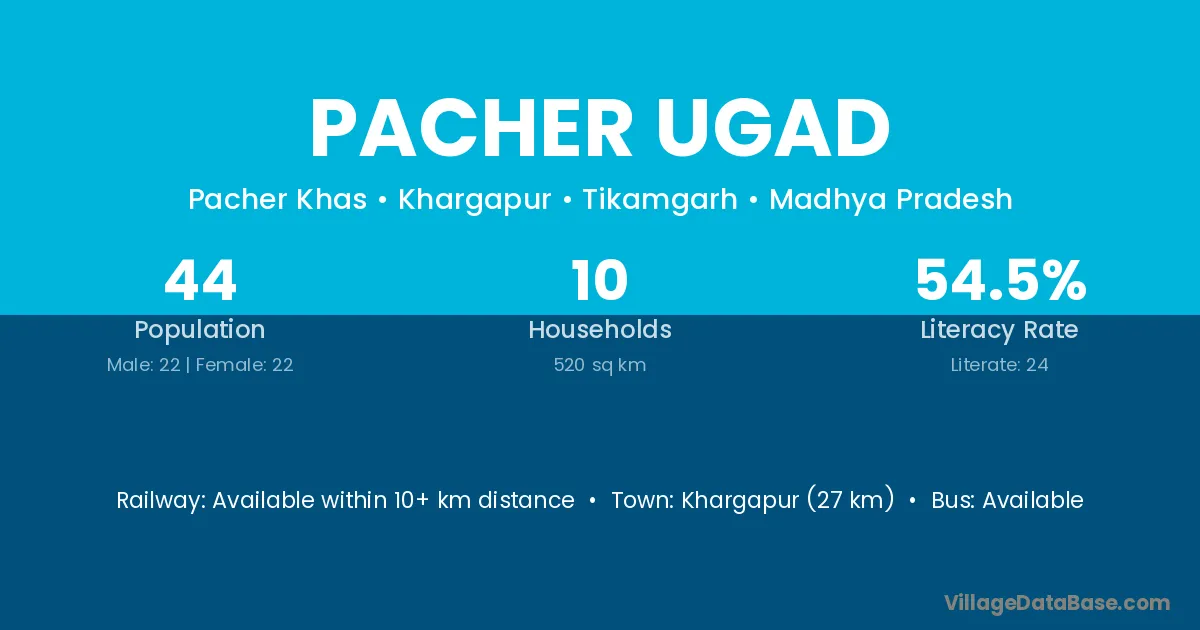 Pacher Ugad village has a total population of 44 people, of which 22 are males and 22 are females.