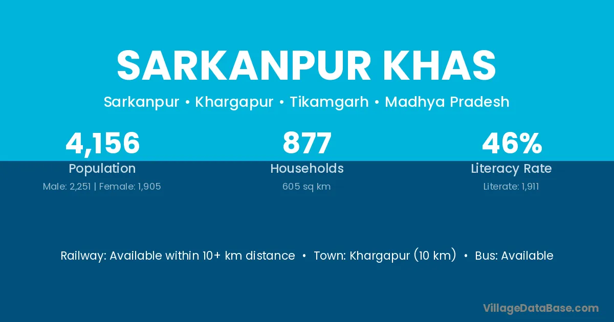 Khargapur (10 km) is the nearest town to Sarkanpur Khas village for major economic activities and is located approximately 10 km away.