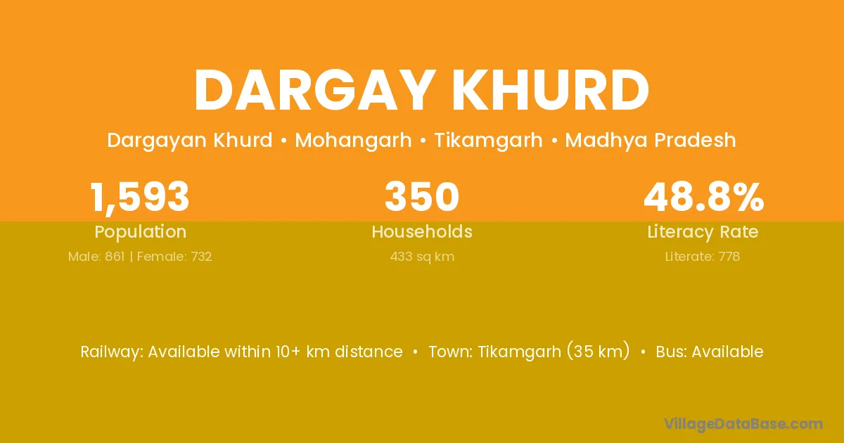 Tikamgarh (35 km) is the nearest town to Dargay Khurd village for major economic activities and is located approximately 35 km away.