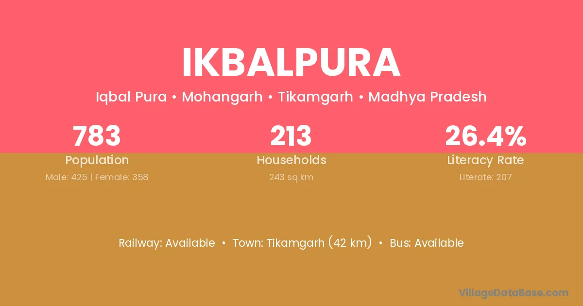 Tikamgarh (42 km) is the nearest town to Ikbalpura village for major economic activities and is located approximately 42 km away.