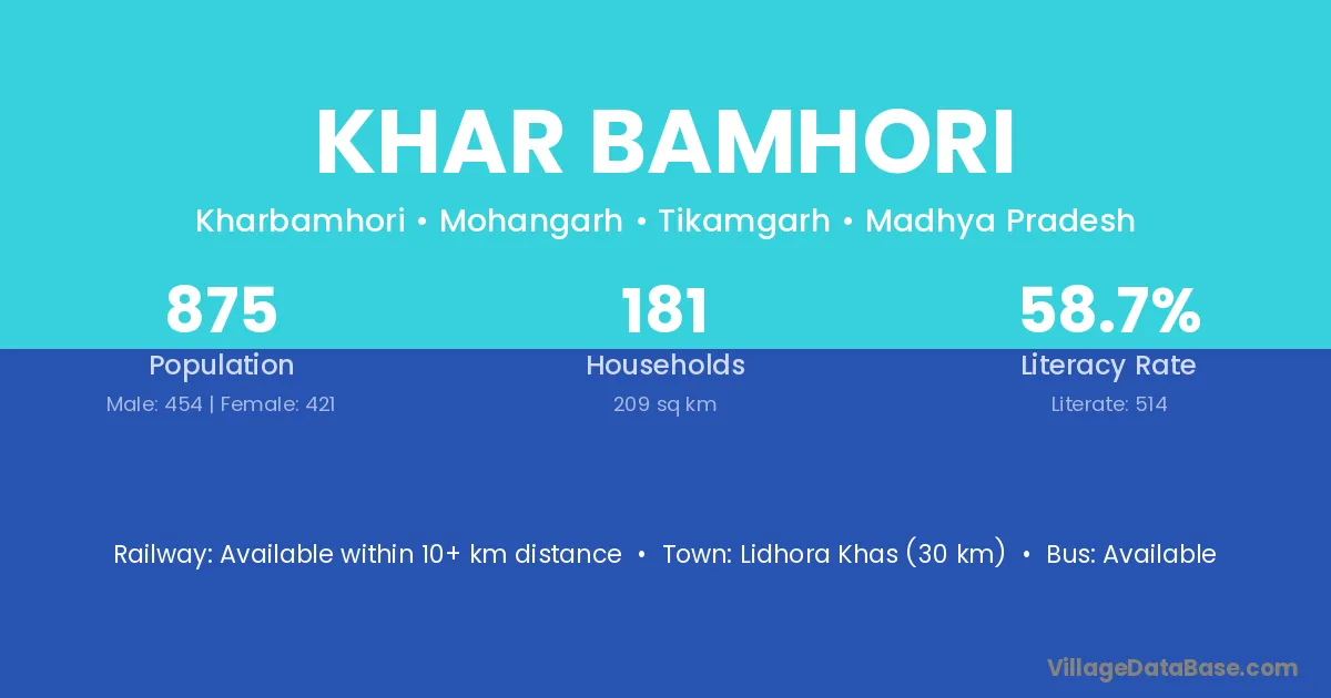 Lidhora Khas (30 km) is the nearest town to Khar Bamhori village for major economic activities and is located approximately 30 km away.