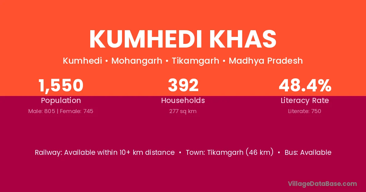 Tikamgarh (46 km) is the nearest town to Kumhedi Khas village for major economic activities and is located approximately 46 km away.