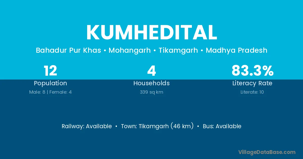 Tikamgarh (46 km) is the nearest town to Kumhedital village for major economic activities and is located approximately 46 km away.