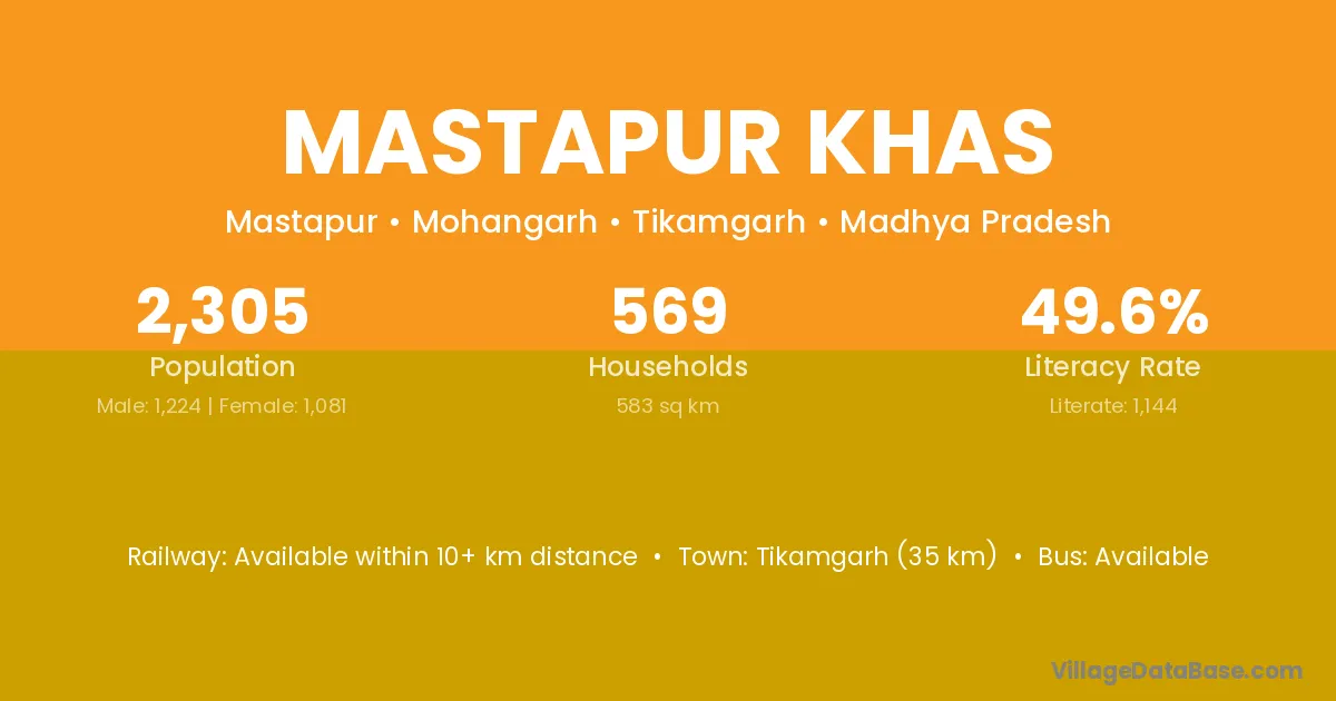Tikamgarh (35 km) is the nearest town to Mastapur Khas village for major economic activities and is located approximately 35 km away.