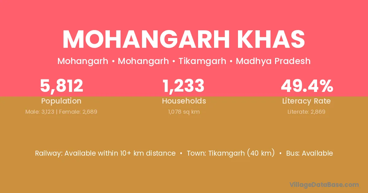 Tikamgarh (40 km) is the nearest town to Mohangarh Khas village for major economic activities and is located approximately 40 km away.