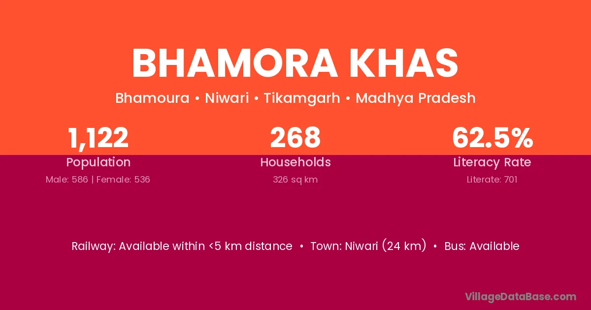 Niwari (24 km) is the nearest town to Bhamora Khas village for major economic activities and is located approximately 24 km away.