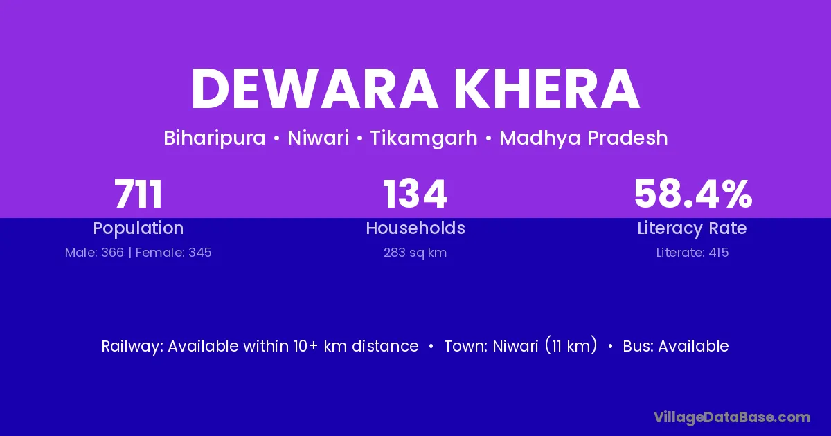 Niwari (11 km) is the nearest town to Dewara Khera village for major economic activities and is located approximately 11 km away.