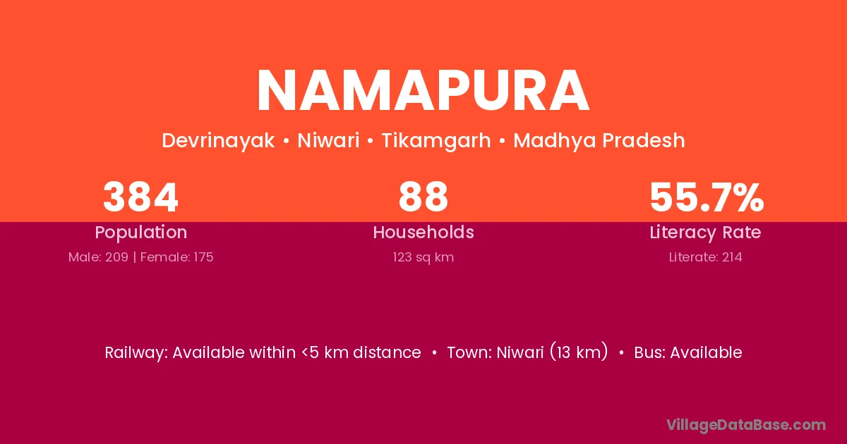 Niwari (13 km) is the nearest town to Namapura village for major economic activities and is located approximately 13 km away.