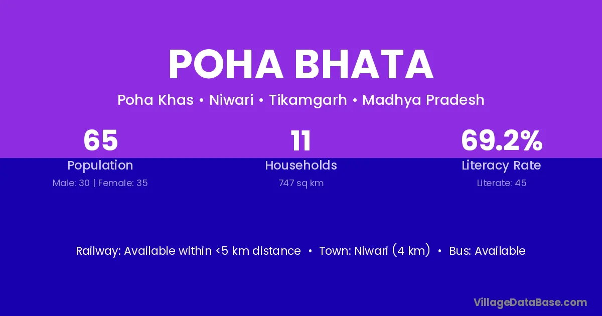 Niwari (4 km) is the nearest town to Poha Bhata village for major economic activities and is located approximately 4 km away.