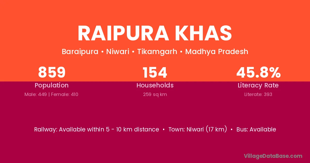 Niwari (17 km) is the nearest town to Raipura Khas village for major economic activities and is located approximately 17 km away.