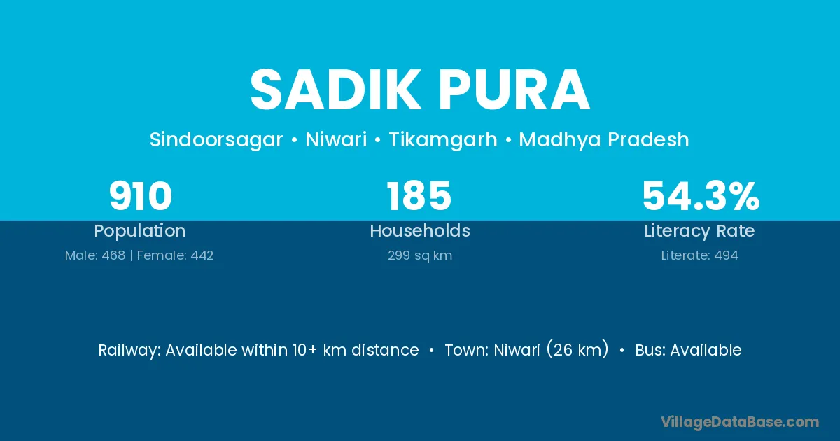 Niwari (26 km) is the nearest town to Sadik Pura village for major economic activities and is located approximately 26 km away.