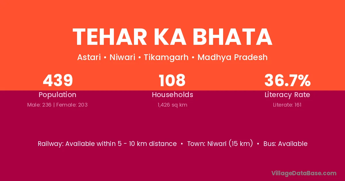 Tehar Ka Bhata village has a total population of 439 people, of which 236 are males and 203 are females.