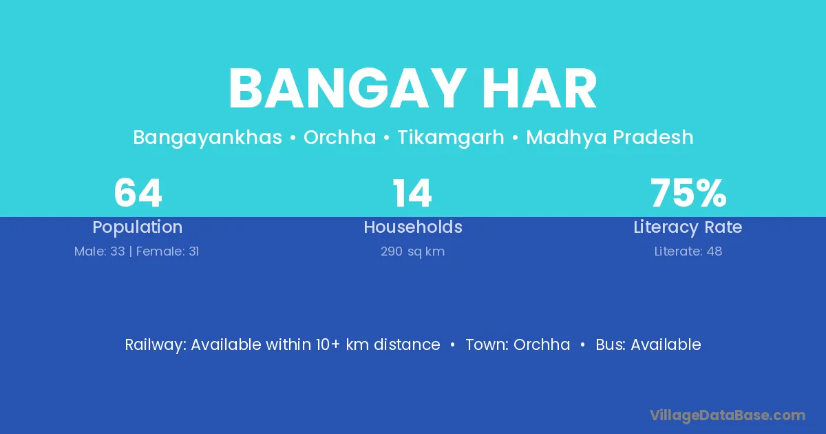 Bangay Har village has a total population of 64 people, of which 33 are males and 31 are females.