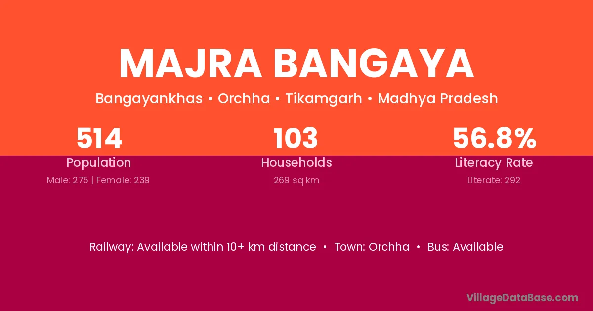 Majra Bangaya village has a total population of 514 people, of which 275 are males and 239 are females.