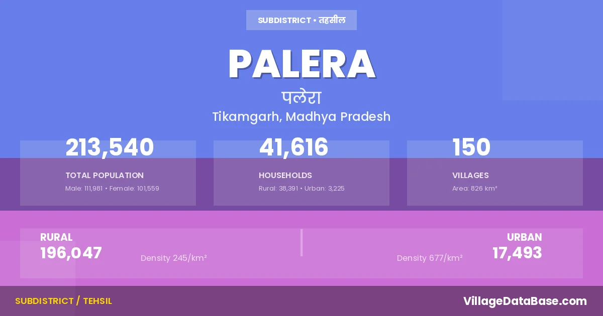 According to the 2011 census The total area of Palera Tehsil is 826 km², with a population of 213540 people. The population density is 259 inhabitants per square kilometre, and there are approximately 41616 houses in the sub district.