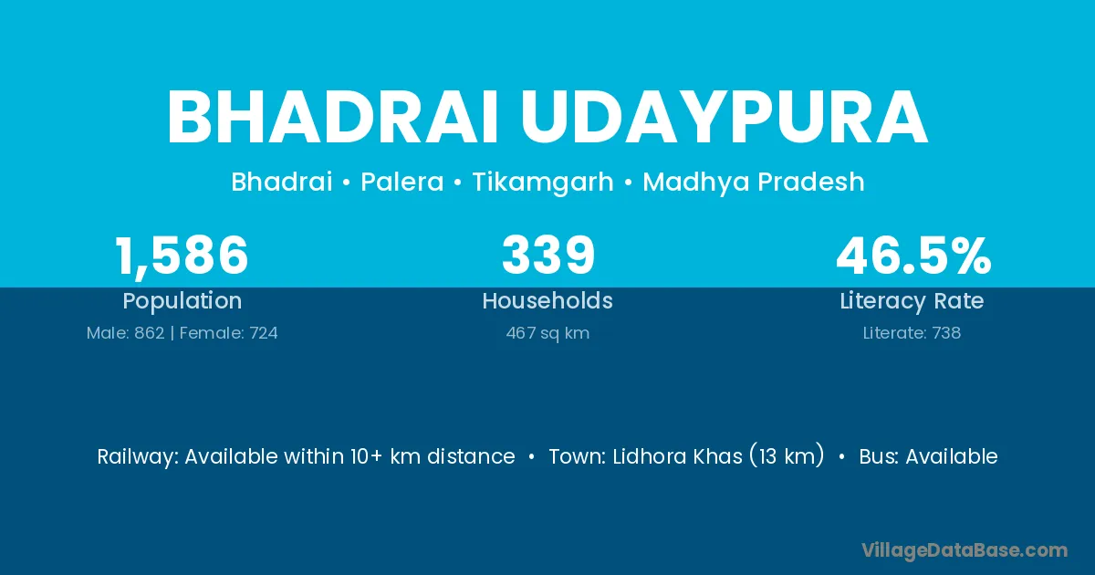 Lidhora Khas (13 km) is the nearest town to Bhadrai Udaypura village for major economic activities and is located approximately 13 km away.