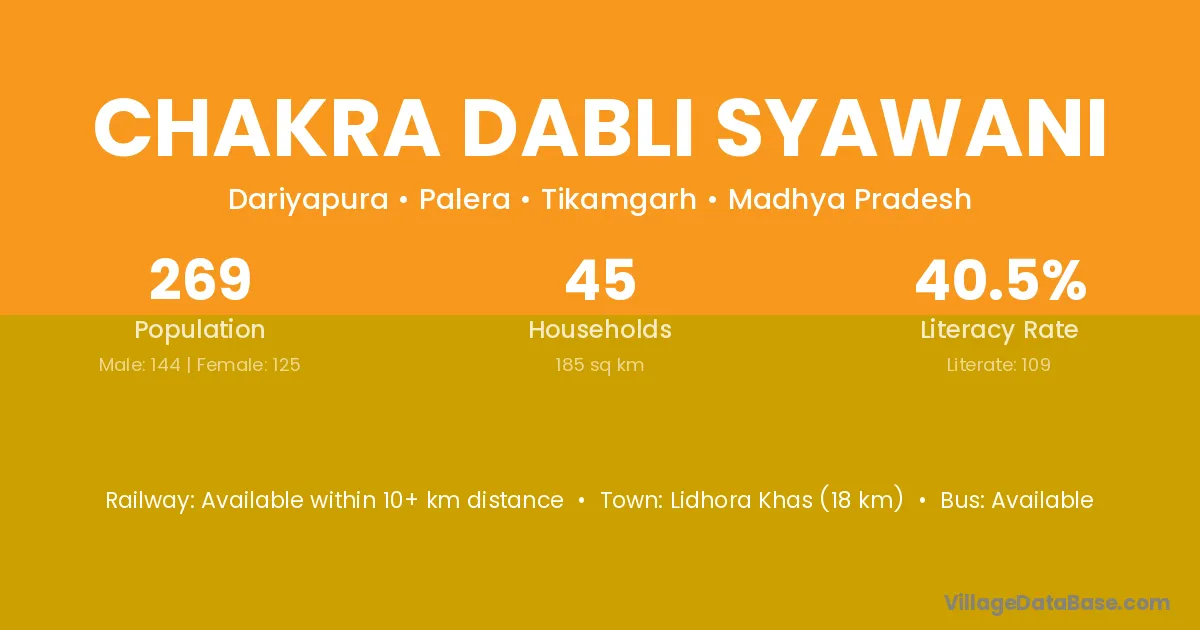 Lidhora Khas (18 km) is the nearest town to Chakra Dabli Syawani village for major economic activities and is located approximately 18 km away.