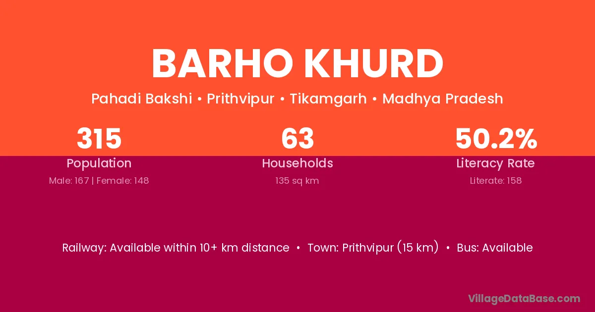 Prithvipur (15 km) is the nearest town to Barho Khurd village for major economic activities and is located approximately 15 km away.