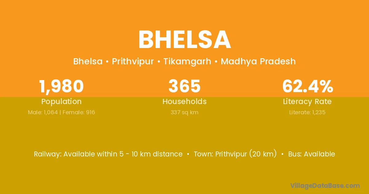 Prithvipur (20 km) is the nearest town to Bhelsa village for major economic activities and is located approximately 20 km away.