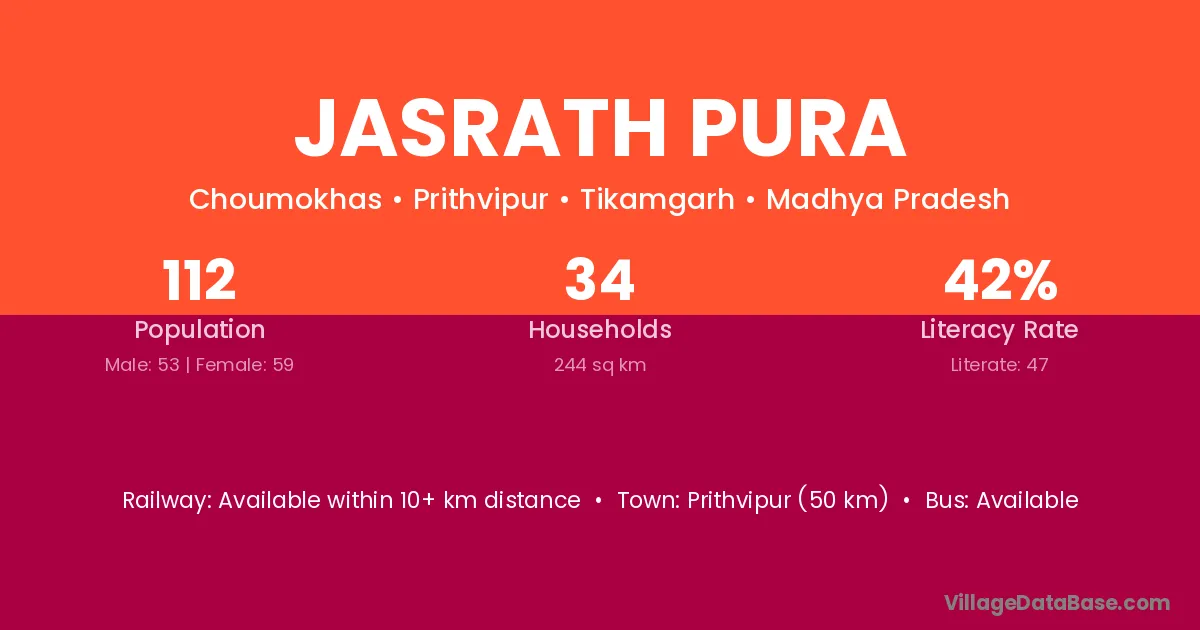 Jasrath Pura village has a total population of 112 people, of which 53 are males and 59 are females.