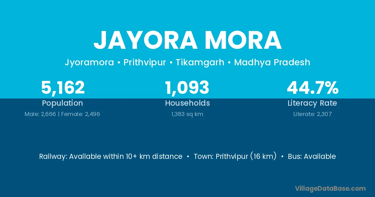 Prithvipur (16 km) is the nearest town to Jayora Mora village for major economic activities and is located approximately 16 km away.