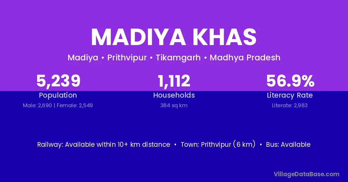 Prithvipur (6 km) is the nearest town to Madiya Khas village for major economic activities and is located approximately 6 km away.