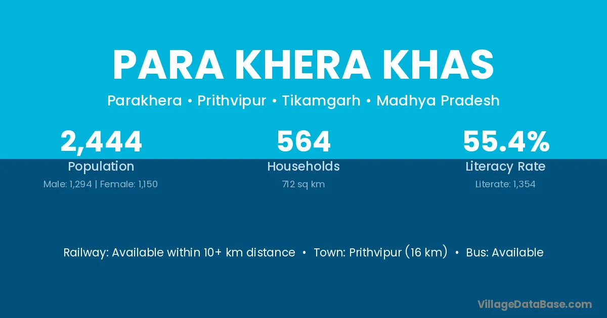 Prithvipur (16 km) is the nearest town to Para Khera Khas village for major economic activities and is located approximately 16 km away.