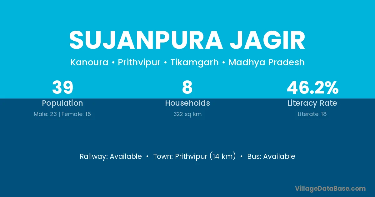 Prithvipur (14 km) is the nearest town to Sujanpura Jagir village for major economic activities and is located approximately 14 km away.