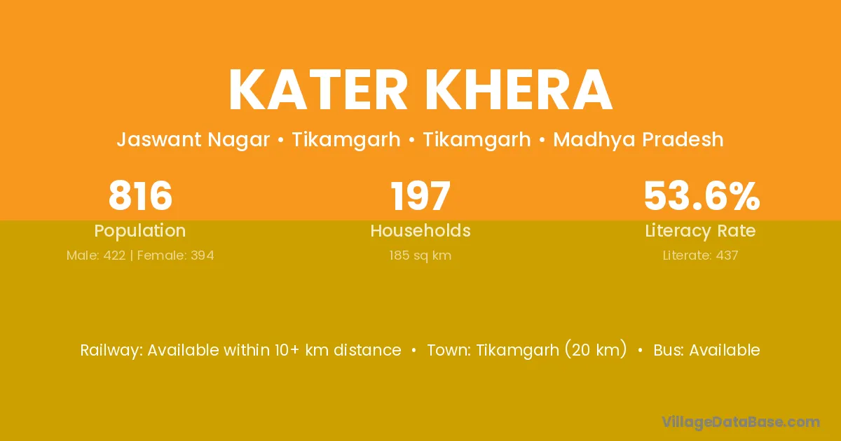 Tikamgarh (20 km) is the nearest town to Kater Khera village for major economic activities and is located approximately 20 km away.