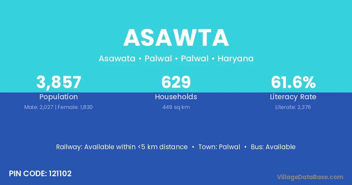 The literacy rate of Asawta village is 62.05%. Male literacy stands at 72.76% and female literacy at 50.55%.