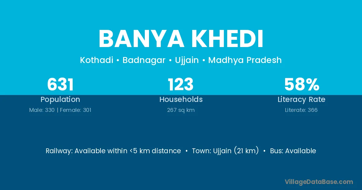 Ujjain (21 km) is the nearest town to Banya Khedi village for major economic activities and is located approximately 21 km away.