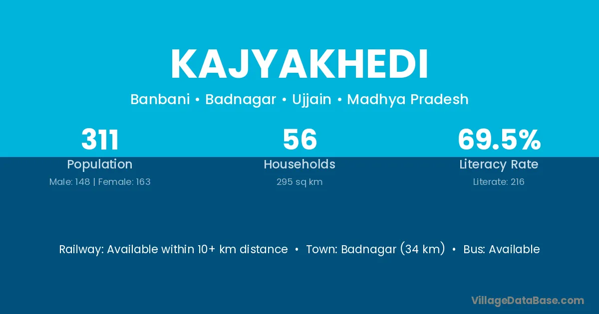 Badnagar (34 km) is the nearest town to Kajyakhedi village for major economic activities and is located approximately 34 km away.