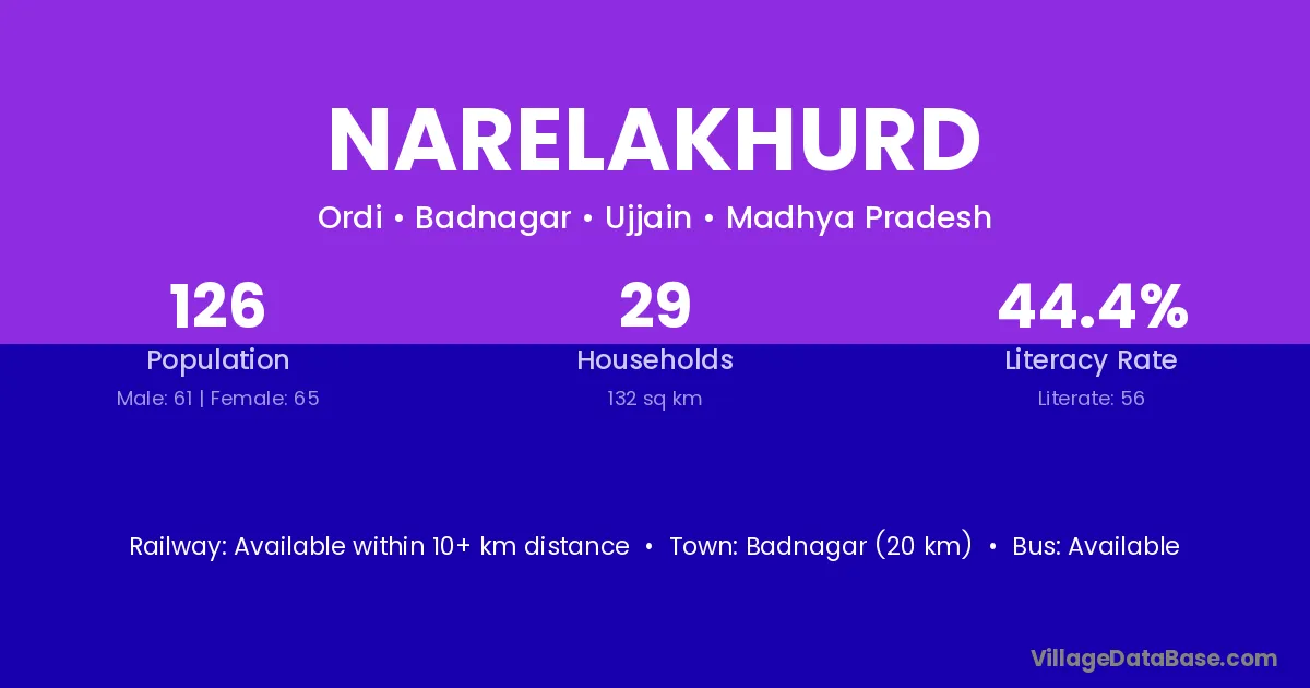 Badnagar (20 km) is the nearest town to Narelakhurd village for major economic activities and is located approximately 20 km away.