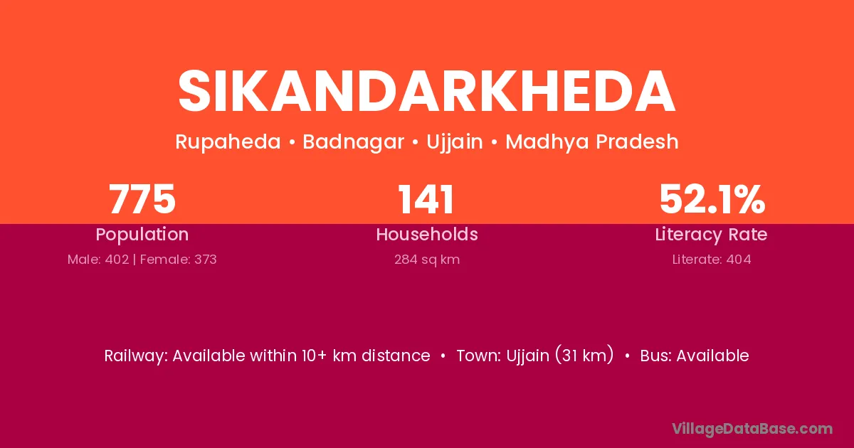 Ujjain (31 km) is the nearest town to Sikandarkheda village for major economic activities and is located approximately 31 km away.