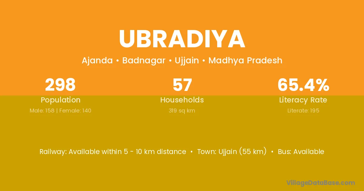 Ujjain (55 km) is the nearest town to Ubradiya village for major economic activities and is located approximately 55 km away.