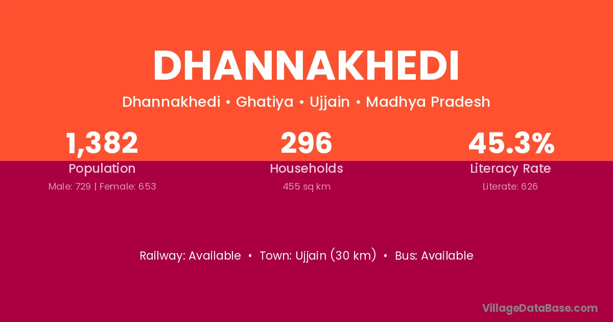Ujjain (30 km) is the nearest town to Dhannakhedi village for major economic activities and is located approximately 30 km away.