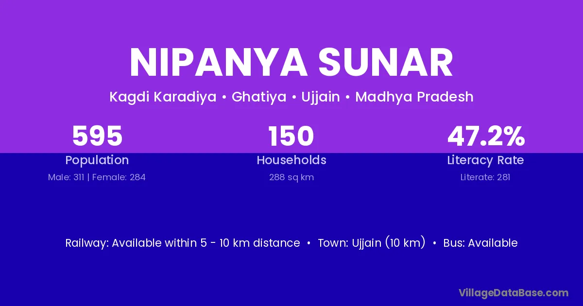 Ujjain (10 km) is the nearest town to Nipanya Sunar village for major economic activities and is located approximately 10 km away.