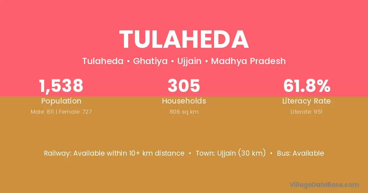 Ujjain (30 km) is the nearest town to Tulaheda village for major economic activities and is located approximately 30 km away.