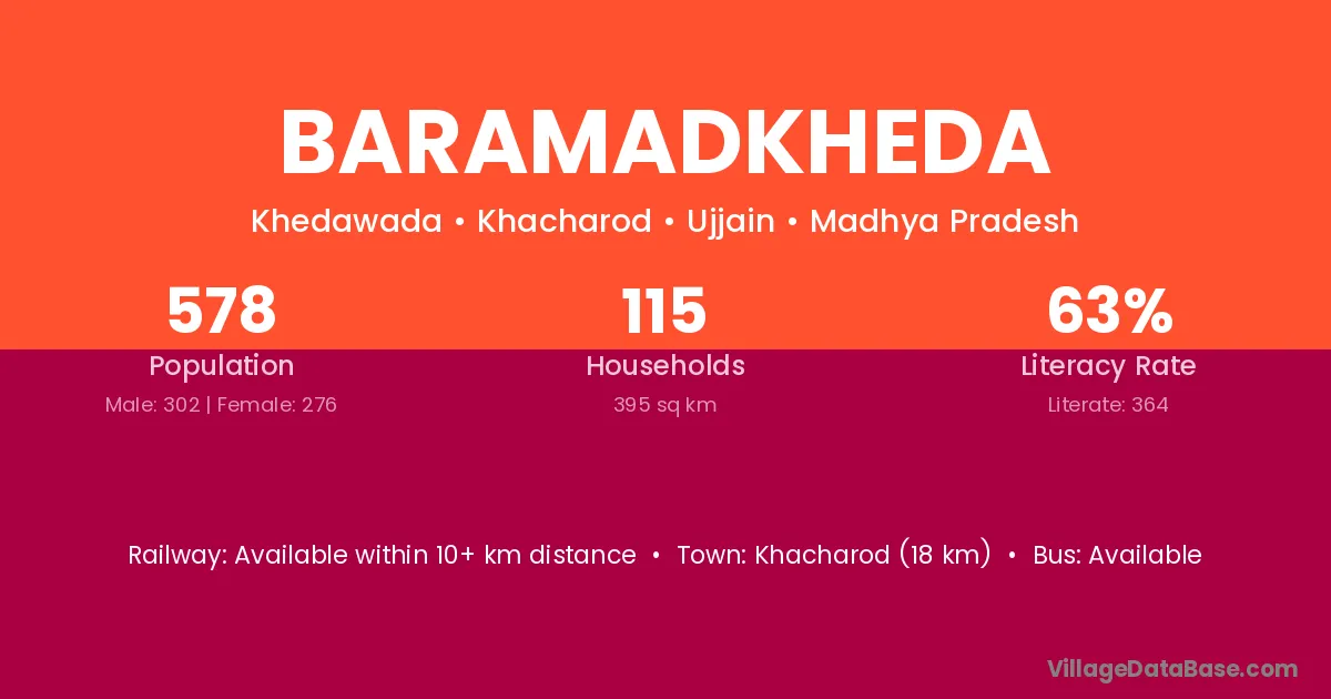 Baramadkheda village has a total population of 578 people, of which 302 are males and 276 are females.