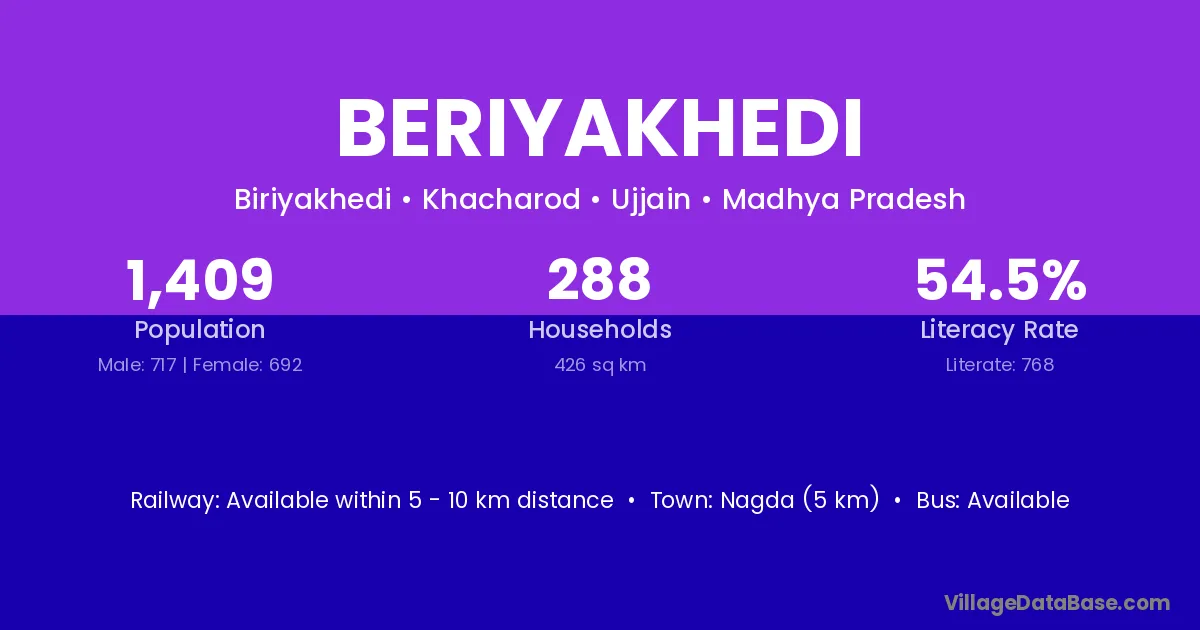 Nagda (5 km) is the nearest town to Beriyakhedi village for major economic activities and is located approximately 5 km away.