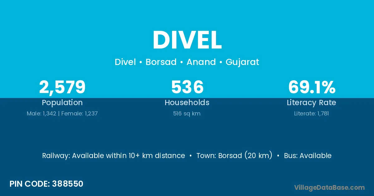 Khacharod (15 km) is the nearest town to Divel village for major economic activities and is located approximately 15 km away.