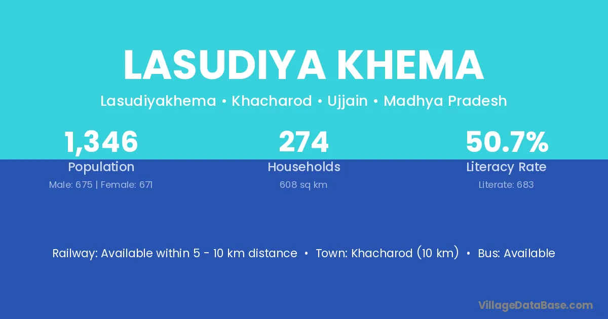 Lasudiya Khema village has a total population of 1,346 people, of which 675 are males and 671 are females.