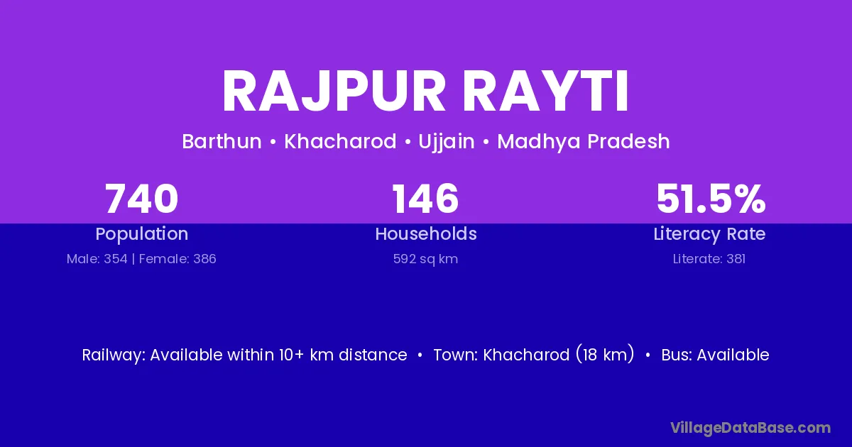 Khacharod (18 km) is the nearest town to Rajpur Rayti village for major economic activities and is located approximately 18 km away.