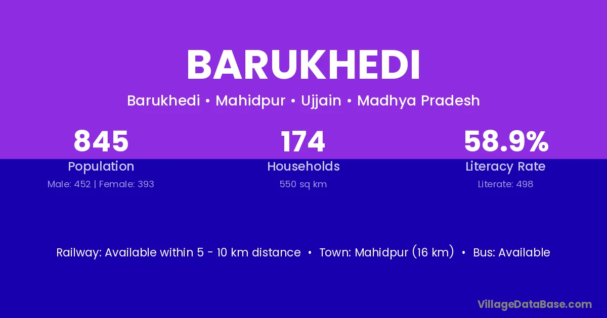 Mahidpur (16 km) is the nearest town to Barukhedi village for major economic activities and is located approximately 16 km away.