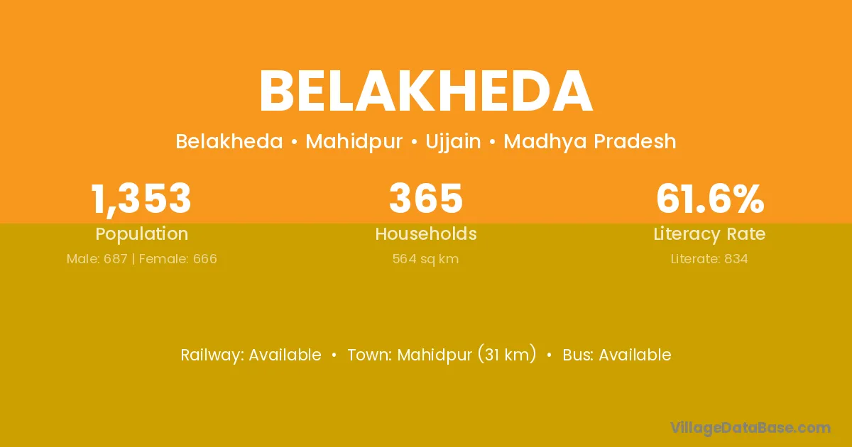 Mahidpur (31 km) is the nearest town to Belakheda village for major economic activities and is located approximately 31 km away.