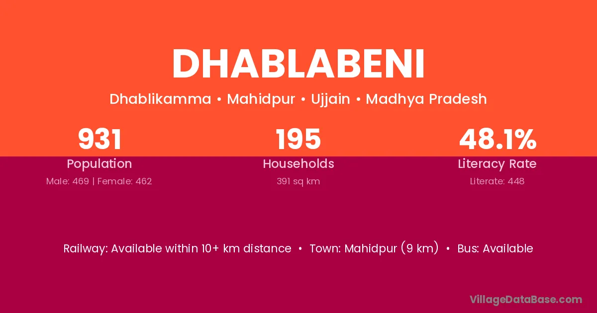 Mahidpur (9 km) is the nearest town to Dhablabeni village for major economic activities and is located approximately 9 km away.